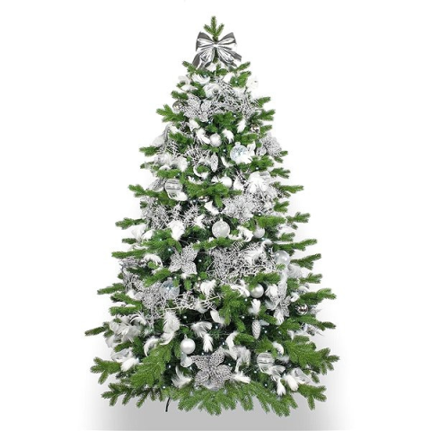 Műfenyő - mű, jedle 3D tűlevéllel, zöld kivitel, magassága 150 cm, szélessége 104 cm, beltéri, a felszereltség része állvány, díszek, fehér és ezüst díszek A remek LAALU feldíszített karácsonyfa - Télkirály, 93 dísz, 150 cm termék fontosabb jellemzői A szemet vonzó LAALU műfenyő belső térben történő használatra készült Megjelenésében és szerkezetében az