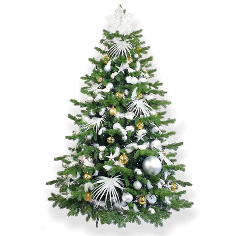 Műfenyő - mű, jedle 3D tűlevéllel, zöld kivitel, magassága 270 cm, szélessége 157 cm, beltéri, a felszereltség része állvány, díszek, fehér, ezüst és arany díszek A dekoratív LAALU karácsonyfa feldíszítve - Polárarany II, 163 dísz, 270 cm termék alapvető jellemzői A remek LAALU műfenyő beltéri használatra alkalmas Hűen utánozza a jegenyefenyőt A háromdimenziós