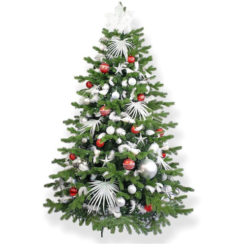 Műfenyő - mű, jedle 3D tűlevéllel, zöld kivitel, magassága 300 cm, szélessége 152 cm, beltéri, a felszereltség része állvány, díszek, ezüst és piros díszek, anyaga PVC A stílusos LAALU karácsonyfa feldíszítve - Polárvörös II, 213 dísz, 300 cm termék alapvető paraméterei A mutatós LAALU műfenyő belső térben történő használatra készült Autentikus jegenyefenyő kinézet