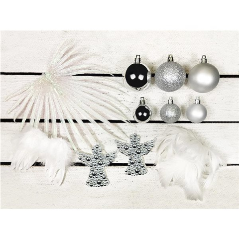Karácsonyfadísz - gömb és figura, kombinált készlet, matt és fényes felület, fehér és ezüst kivitel, 136 db a csomagban A szemet vonzó LAALU karácsonyi díszek - Angyalszárnyak készlet, 240 - 270 cm fákhoz termék alapvető tulajdonságai Fehér és ezüst kivitel, matt és fényes finissel A csomagolásban található: 136 darab