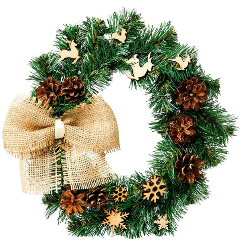 Koszorú asztalra - karácsonyi, felakasztható, díszített, anyaga PVC és fa, 50 cm külső átmérő, barna és zöld kivitel Věnec LAALU LESNÍ POHÁDKA zaujme na první pohled svým přírodním designem. Lze použít k dekoraci stolu, okna, dveří i krbu. Tvořený je PVC větvičkami a ozdobený šiškami, postavičkami jelínků a