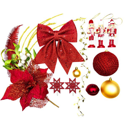 Karácsonyfadísz - gömb, figura és masni, kombinált készlet, műanyag, matt felület, fehér, piros és arany kivitel, 34 db a csomagban A mutatós LAALU Piros diótörő díszkészlet, 100 cm fákhoz termék fontosabb jellemzői Az ízléses LAALU karácsonyfa díszek ellenálló műanyagból készültek Fehér, piros és arany kivitel, matt hatással A cs