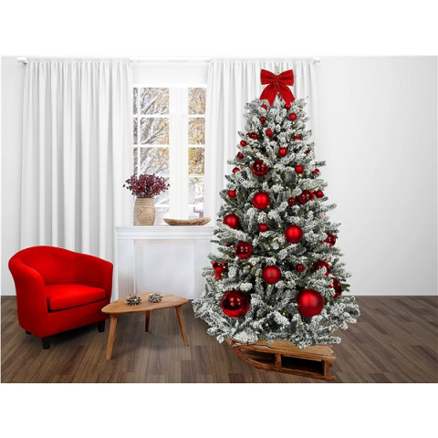 Műfenyő - mű, jedle 2D tűlevéllel, fehér kivitel, magassága 180 cm, szélessége 116 cm, beltéri, a felszereltség része állvány és tűzálló bevonat, díszek és havas borítás, piros díszek A dizájnos LAALU Piros karácsony - karácsonyfa feldíszítve - 73 dísz, 180 cm termék legfontosabb jellemzői A stílusos fehér színű LAALU műfenyő benti használatra készült Alakja és tűlevelei hűen utáno