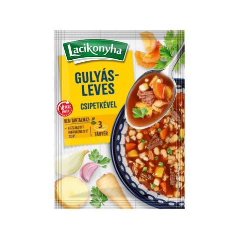 Lacikonyha Gulyásleves csipetkével – 71 g Termékleírás A Lacikonyha Gulyásleves csipetkével egy igazán hagyományos, Magyarországon kedvelt ízvilágot hordozó leves. Gazdag paprika- és marhahússzín, amelyet lágy csipetkével tálalva élvezhetünk. Egyszer