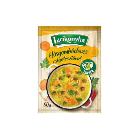 Lacikonyha Húsgombócleves csigatésztával – 60 g Azonnali komfort ebéd vagy vacsora egy finom, húsos krémlevesben: húsgombócok a puha csigatésztával, egy gazdag húsleves alapban. A 60 g-os kiszerelés praktikus és könnyen tárolható, ideálisan elég egy