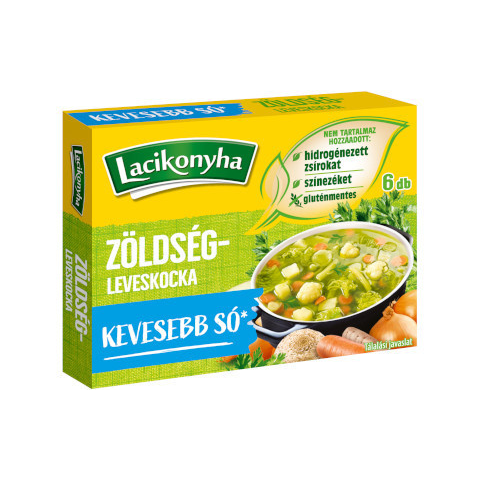 Lacikonyha kocka 60 g Zöldségleves Termékjellemzők Gyors és egyszerű megoldás a mindennapokra: egy kocka feloldása 500 ml vízben pár perc alatt finom zöldségleves készül. Gazdag zöldséges íz – idézi a friss zöldségek aromáját, pikk-pakk feltölti