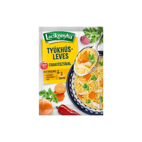 Lacikonyha Tyúkhúsleves csigatésztával 55g Termékleírás Gyors és kiadós – a Lacikonyha Tyúkhúsleves csigatésztával egy klasszikus magyar ízvilág, amely percek alatt kész. A csigatészta különleges textúrát ad a levesnek, így ideális ebéd vagy gyors dé