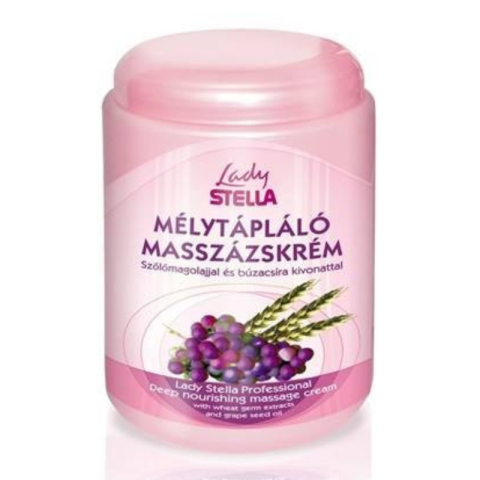 Lady Stella mélytápláló masszázskrém 1000 ml Az antioxidáns szőlőmagolaj hidratál, eredményesen gátolja a sejtöregedést, segít megőrizni a bőr fiatalságát, üdeségét. Telítetlen zsírsavakban gazdag, mely nélkülözhetetlen a bőr és a sejtfalak egészséges