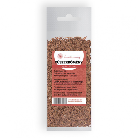 Lakshmy fűszerkömény egész 30 g A zellerfélék családjába tartozó növény magja adja a fűszert. Már ősidők óta hasznosítjuk. Íze kissé fanyar, illata jellegzetes az illóolajában megtalálható karvonnak köszönhetően. Főzve, vagy csak egyszerűen az ételre
