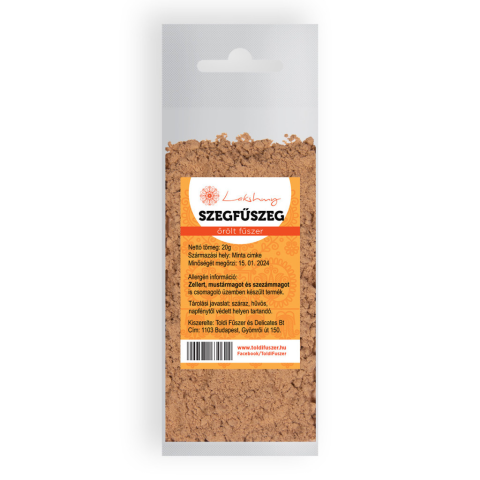Lakshmy szegfűszeg őrölt 20 g A szegfűszeg intenzív, erősen aromás és édeskés illatú, kissé kesernyés, égető ízű fűszer. Alkalmas hús- és halételek, vadételek, mézeskalács, forralt borok, kompótok, édességek, tésztatöltelékek ízesítésére.