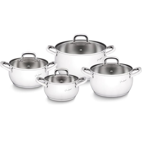 Edénykészlet - gáz, elektromos, indukciós és üvegkerámia főzőlaphoz, 4 fazék a készletben, mérce, sütőben használható és mosogatógépben mosható, maximális sütési hőmérséklet a sütőben 250 °C, edény anyaga rozsdamentes acél, fazék külső felülete rozsdamentes acél, fazék belső felület rozsdamentes acél, fazék nyelének anyaga rozsdamentes acél, fedő a csomagban, ezüst kivitel Ha elegáns, nemesacélból készült edény készletet keresel, amely minden t