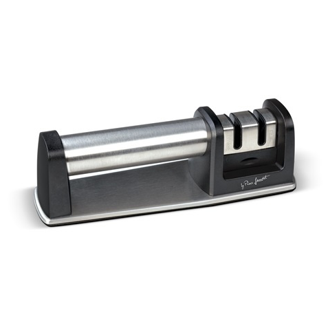 Ez a 2 fokozatú késélező minőségi ABS műanyagból készült, puha felülettel és csúszásgátló talppal a biztonságos használat érdekében. Az élezőt egy volfrám-rozsdamentes acél tárcsa élezi, amely a pengét élesíti és V alakú élét ad neki, valamint egy kerámia kő, amely a pengét csiszolja és kiegyenlíti a felületi egyenetlenségeket. A karbantartáshoz elegendő a pengét nedves ruhával megtörölni. A csiszoló tárcsák nem cserélhetők.