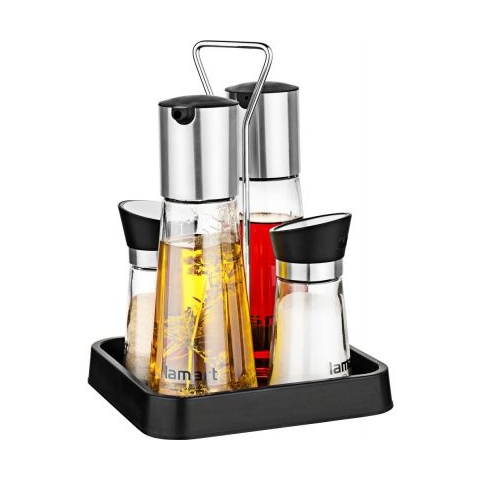 Asztali fűszertartó - 4 darabos készlet sóhoz, borshoz és olajhoz, anyaga üveg, műanyag és acél, űrtartalma 250 ml, magassága 225 mm Sószóró, borsszóró és hajók olaj vagy ecet tartozik minden asztalon. Ezek díszített stílusos design és kiváló minőségű kivitelezés a márkára jellemző LAMART. Helyezni egy praktikus állvány a könnyű ho