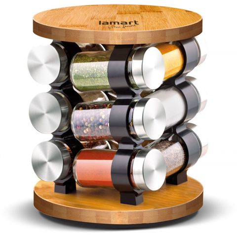 Fűszertartó szett - forgatható bambusz állványon, modern kivitelben, tartós üvegből készült fűszertartók, fedél nélkül mosogatógépben mosható, anyaga: fa, rozsdamentes acél, üveg, szín: tiszta, térfogat: üveg: 85 ml, méret: 19 x 19 x 22,5 cm, üveg átmérője: 4 cm , magassága 9,3 cm You can easily place a modern swivel bamboo stand with twelve roots on a shelf or kitchen unit, so you will always have it at hand, without the need for complicated assembly. Lamart LT7051
