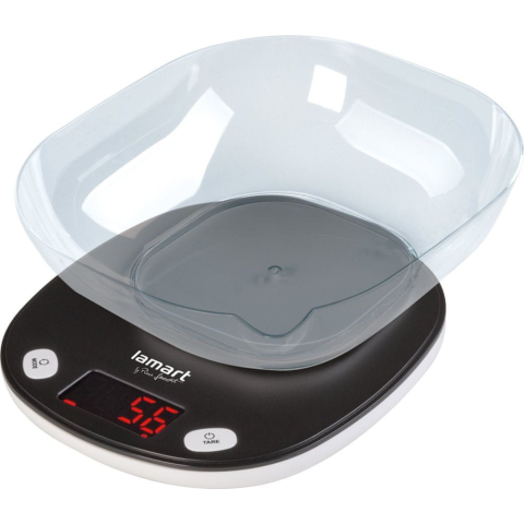 Vezérlő gombokkal ellátott mérleg, nagy LCD kijelzővel és praktikus, 1000 ml űrtartalmú, kivehető tállal. Tömör műanyag felület a könnyű és higiénikus karbantartáshoz. Fokozatos mérést és az edény tömegének lenullázását lehető