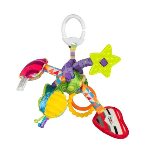 Babakocsi játék - autós gyerekülésre vagy kiságyra is, függő, klipes rögzítés, susogó, rágóka és tükör a csomag része formák motívum, ajánlott újszülött kortól Ez a titokzatos csomó formájú csörgő különböző színű és alakú puha hengerekből áll össze, amelyeket ki lehet húzni, majd vissza lehet dugni a helyükre. A gyerekek tehát huzigálhatják, fogdos