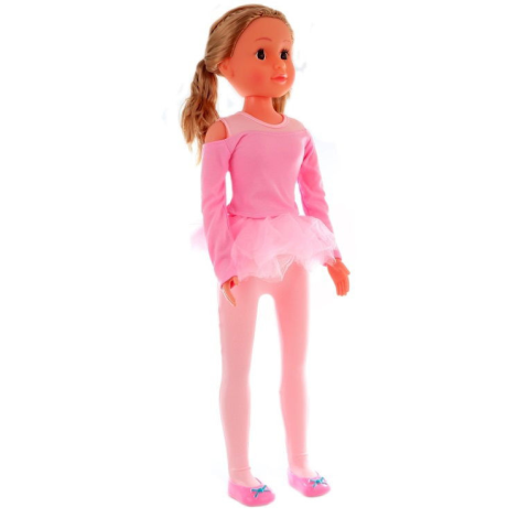 A babának mozgatható karjai és lábai vannak. A babának hosszú haja és modern ruhája van.