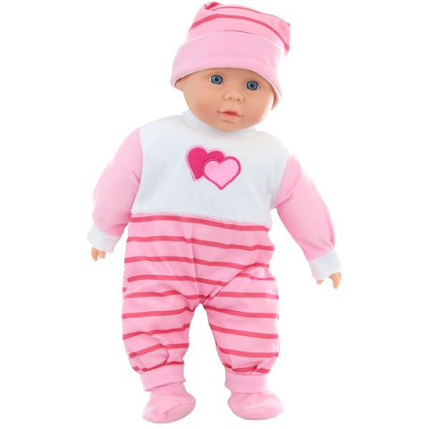 Játékbaba - interaktív, műanyag, csecsemő, hangokat ad ki, puha test, magassága 40 cm, 3 AG13 elem (nincs mellékelve), ajánlott 3 éves kortól A kislányok, akik gondoskodni szeretnének egy kisbabáról, szívesen fognak játszani ezzel a babával, és gyakran visszatérnek hozzá. Puha teste ugyanis ideális a gyermekek játékához. Ha megnyomják, külö