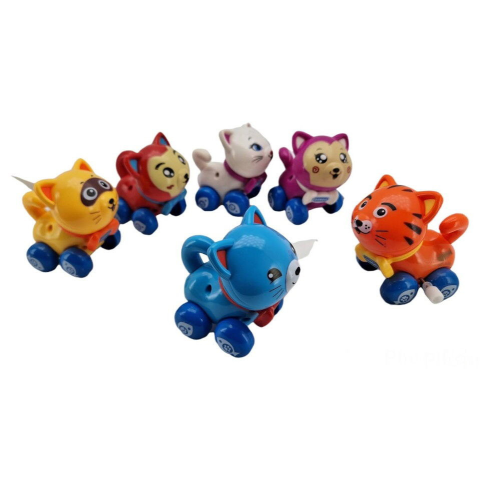 Színes kiscicák felhúzhatóak. Felhúzás után a macska kerekek segítségével járni kezd, mozgatja a farkát és elfordítja a fejét.