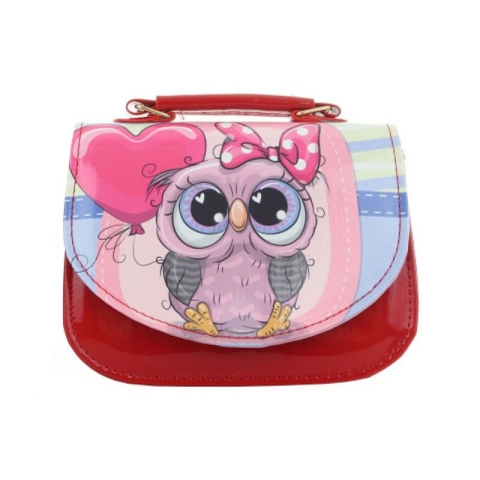 Piros lakkozott kézitáska bagoly motívummal. A táska kézben vagy vállon is hordható. A vállpánt levehető és állítható hosszúságú.