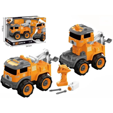 Csavarozható vontató autó távirányításra. Az autó a mellékelt csavarhúzóval vagy fúróval összecsavarozható. Lehetőség van egy motor eltávolítására a fúróból, amelyet behelyeznek az autóba, majd a vezérlő segítségével előre hátra hajt. Az autó robottá