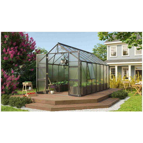 Gyártó - VITAVIA GARDEN - Nagy-BritanniaAz OLYMP sorozat üvegházai a PREMIUM kategóriába tartoznak - az üvegházat egy brit márkás gyártó készíti. eloxált alumínium profilokból készül. Az üvegezés 6 mm vastag,   hőszigetelő cellás polikarbonát lemezekből készül. A tetőablakok 4   mm-es polikarbonát üvegezésűek. Az üvegezés acélkapcsokkal van rögzítve   az alumínium profilokhoz.Polikarbonát - nagyon jó   minőségű duplafalú polikarbonát erős UV szűrő