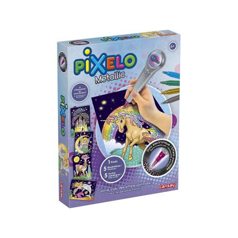 A Pixelo Metál készlettel a gyerekek gyönyörű, színes képeket készíthetnek pillanatok alatt.Ahhoz, hogy megszülessenek a különleges, pontozott mintával díszített alkotások, a gyerekeknek szükségük lesz a Pixelo tollra és egy kiválasztott, pontozható mesebeli képre.Az elektronikus toll használata egyszerű: a kis alkotóknak csak bele kell helyezniük a színes, metál fényű filctollak valamelyikét a pontozóeszközbe, ami - a bekapcsolást követően - mozgatni kezdi a