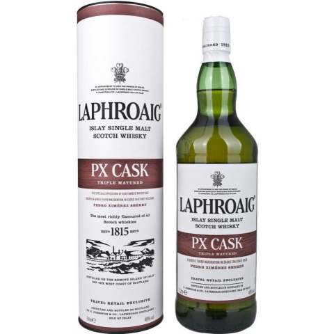 Laphroaig PX Cask antik aranyszínű whisky, a palackból a mazsola kellemes sherry aromája, egy csipetnyi édes édesgyökér és csak a tőzeg legcsekélyebb csípése árad. Egy kis víz hozzáadásával felszínre tör a marcipán és a mandula aromája, a krémes dió é