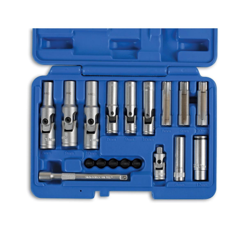 Laser Tools - UK 18 darabos Univerzális készlet kifejezetten izzítógyertyák szerelésére kifejlesztve. Készlet tartalmazza a legújabb fejlesztésű PSG (Pressure Sensor Glow Plug) izzítógyertyák szereléséhez Speciális műanyag védő és megvezető dugókat i