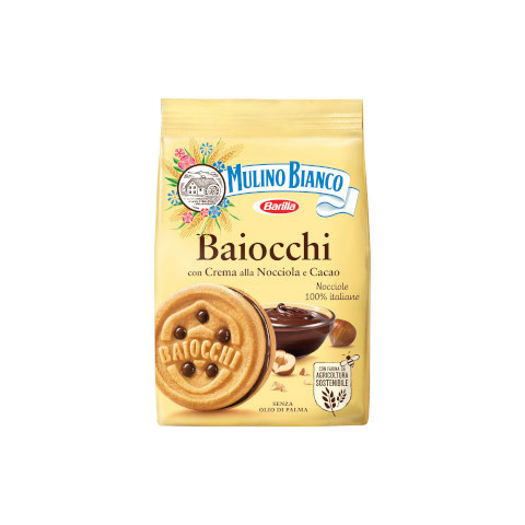Mulino Bianco Baiocchi Mogyorós keksz – 260 g A Baiocchi Mogyorós keksz a Mulino Bianco hagyományos ízvilágát hozza el egy praktikus, 260 g-os kiszerelésben. Ropogós külső és aromás mogyoró darabok alkotják a tökéletes nassolnivalót uzsonnára, kávé m