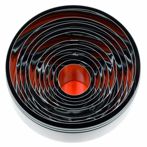 11 darabos Lauterjung Solingen kerek kiszúrókészlet sima éllel, dobozban. Méretek 2,5 cm-től 9,5 cm-ig. Fémből készült. Cukrászoknak alkalmas.