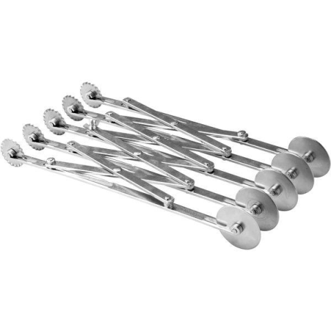 Rozsdamentes acél tésztavágó Lauterjung Solingen, 5 sima és 5 hullámos pengével. A vágásszélesség állítható akár 23 cm-ig. Króm-nikkel acélból készült, átmérője 55 mm. Mindenkinek hasznos konyhai segédeszköz.