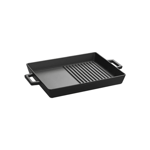 Lava Grill tepsi, méretei 26 x 32 cm, anyaga öntvény. A belső felület egyik része bordázott, a másik pedig sima. Az öntvény nehezen melegedik át, de egyszer átmelegedve hosszú ideig tartja a hőt. Az öntvény edények valamennyi főzési technika alkalmazásához megfelelnek, legyen az sütés, lassú főzés vagy sütőben történő elkészítés. Tulajdonságai: Az edény oldalának vastagsága 4 mm. Az edény belső felületén egy fekete zománcréteg van, amely zsiradék hasz