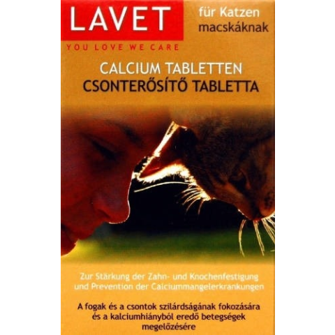 Lavet Calcium Tabletten - Vitamin készítmény (csonterősítő) macskák részére 40g/50db tbl.A LAVET CSONTERŐSÍTŐ tabletta macskának a táplálkozás-élettani és gyógyszertani ismeretek alapján összeállított készítmény, amely a tej és a szárított élesztő magas biológiai értékű természetes alkotórészeit, valamint jól értékesülő kalcium-és foszforvegyületeket biztosít kedvenceink optimális táplálásához.Ezáltal a termék a normális csont- és fogfejlőd