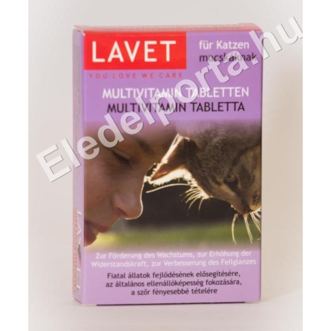 A LAVET csonterősítő, mulivitamin, bőrtápláló és algás multivitamin tabletták állatorvosok által fejlesztett, természetes eredetű, a szervezet számára nélkülözhetetlen anyagokat tartalmazó táplálékkiegészítők. A Multivitamin életfontosságú vitaminjai, mikroelemei és a készítményben található nagyértékű élesztőfehérje elősegíti a fiatal állatok fejlődését, fokozza a betegségekkel szembeni ellenállóképességet, a vitalitást valamint a szőr fényességét. Így ideális étrendkiegészítője minden fajtájú és korú macskának.A felhasználás módjaSzájon át.Javasolt adagolásÁltalános adag: 1-2 tabletta/állat/nap.Kölyökcicáknak: 1/2-1 tabletta/nap.A készítményt kúraszerűen, több héten keresztül célszerű alkalmazni. Az ízesített tablettákat a kutyák általában önként, szívesen elfogyasztják. Ha valamilyen októl az állat a tablettát önmagában nem eszi meg, célszerű az az eledelébe keverni.