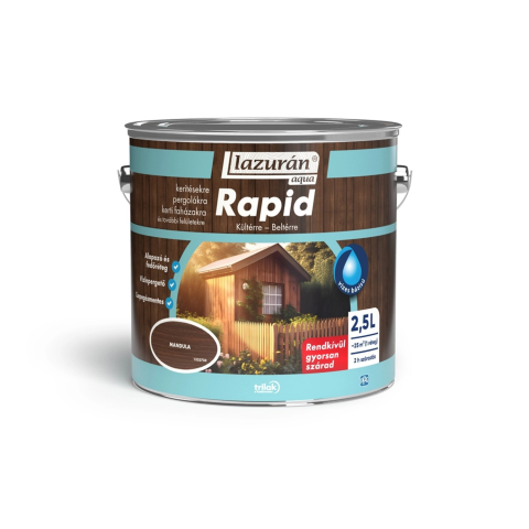 Vizes vékonylazúr kültérre - beltérre A Lazurán Aqua Rapid rendkívül gyorsan száradó vizes bázisú vékonylazúr, melynek bevonata fizikai védelmet nyújt a gombák ellen. Mélyen beszívódik a farostok közé, ezáltal növeli a fafelület vízlepergető hatását, miközben kiemeli a fa eredeti erezetét. Könnyen felhordható, nem csepeg. - Rendkívül gyorsan szárad - Csepegésmentes - Alapozó és fedőréteg - Vízlepergető