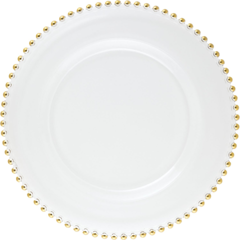 LE COQ Helios sekély tányér, 340 mm átmérővel, arany gyöngyszerű peremmel. Üvegből készült. Az elegáns dizájn Héliosz napisten ragyogó koronáját idézi. Alkalmas éttermekbe és hotelekbe is. A LE COQ PORCELAINE elismert olasz márka, több mint 50 éves múltra tekint vissza a professzionális porcelán gyártásában a vendéglátás számára.