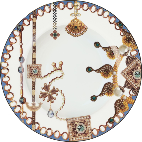 LE COQ Lithos lapos tányér, átmérő: 300 mm. A fehér tányért kék, drágakőszerű díszítés ékesíti. New Bone China-ból készült, ami egy modern kerámiaanyag, amely a klasszikus csontporcelánt utánozza állati eredetű összetevők felhasználása nélkül. A tányér éttermek és hotelek számára is alkalmas. Lithos sorozat.
