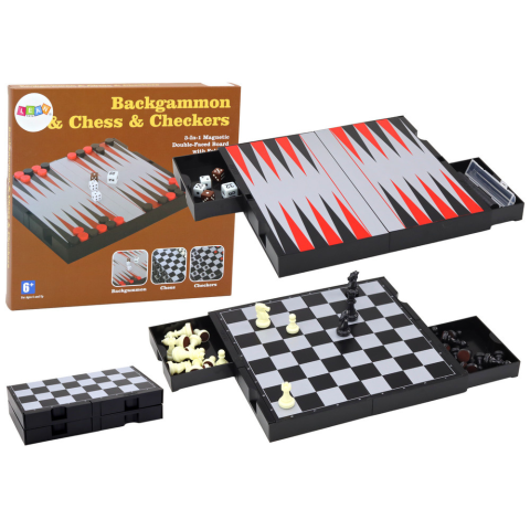 3 az 1-ben játékszett mágneses tábla sakk dáma backgammon 3 az 1-ben játékkészlet mágneses táblával, sakkkal, dámával és backgammonnal. A 3 az 1-ben tábla egy sokoldalú játékkészlet, amely tökéletesen megfelel a klasszikus szórakozás szerelmeseinek elv