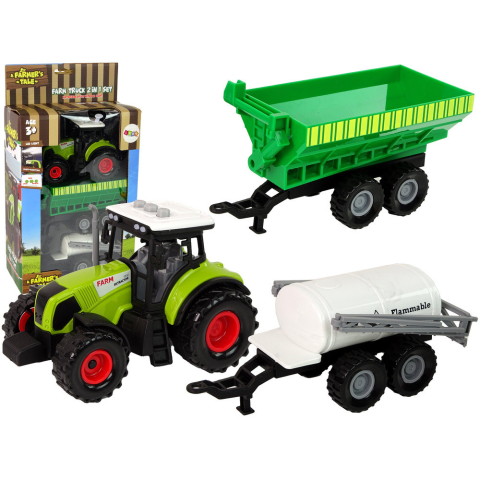Traktor szett gépekkel, tartályos pótkocsival, LED világítással és hangokkal Fantasztikus készlet a kis gazdáknak: traktor két pótkocsival. Teremts multifunkcionális farmot a játékainkkal! Órákon át tartó szórakozás az egész családnak! A készlet ösztönzi a kreativitást, a képzelőerőt és támogatja a gyermek motoros készségeinek fejlődését. A készlet különböző típusú mezőgazdasági járművek miniatűrjeit tartalmazza, amelyek tökéletesen reprodukálj