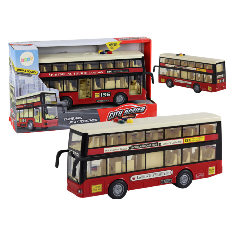 Emeletes városi busz piros fényekkel 1:16 Emeletes Városi Busz Piros Hangjelzésű Fényekkel 1:16 A busz pirosra van festve, ami azonnal felkelti a gyerekek figyelmét. Dörzshajtással van felszerelve, ami azt jelenti, hogy a gyermek könnyen mozgásba hozha