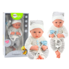 1 kép Lean Toys Baba baba fehér és szürke csíkos ruhában, sapkában, cumiban, paplanban