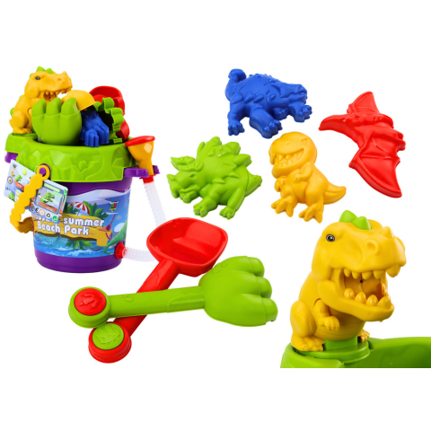 1 kép Lean Toys Homokos vödör készlet zuhany öntözőkannával és formákkal, dinoszauruszok készlettel