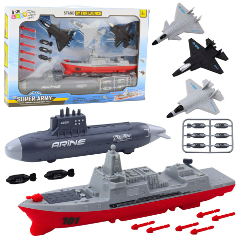 Katonai készlet hajó tengeralattjáró vadászgépek rakéták KATONAI KÉSZLET – HAJÓ, TENGERALATTJÁRÓ, VADOTT, KIEGÉSZÍTŐK A repülőgép-hordozót, tengeralattjárót és három vadászrepülőgépet tartalmazó katonai készlet nagyszerű ajánlat azoknak a gyerekeknek,
