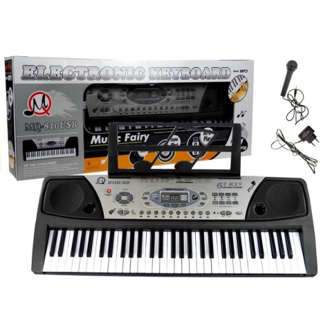 MQ-810 MP3 billentyűzet mikrofonnal, 61 billentyűvel MQ-810 MP3 billentyűzet mikrofonnal 61 billentyű Elemmel is működtethető - 6 db R6. A készlet tartalmaz egy tápkábelt és egy mikrofont, 2 db sztereó hangszórót - kétutas hangszórórendszert. A billent
