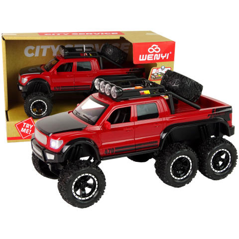 Terepjáró súrlódásos meghajtású nagy kerekű autó 1:16 piros TEREPJÁRÓ VILÁGÍTÁS HANGOK PIROS 1:16 A dörzshajtású terepjáró ideális játék azoknak a gyerekeknek, akik szeretik a dinamikus vezetést és az izgalmas kalandokat. Realisztikus megjelenése, leny