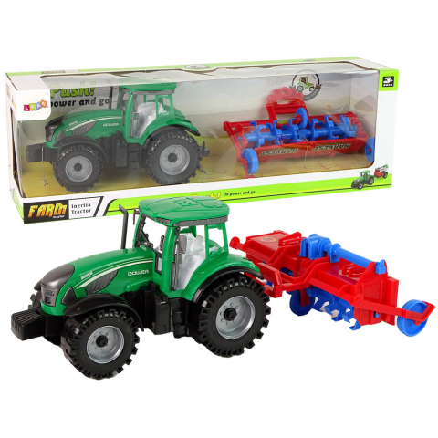 Traktor eke súrlódásos meghajtással piros Ez a tökéletes játék a kis mezőgazdasági rajongók számára. A traktort a részletekre való odafigyeléssel készítették, így úgy néz ki, mint egy igazi mezőgazdasági jármű. A kisgyermekek igazi gazdáknak érezhetik