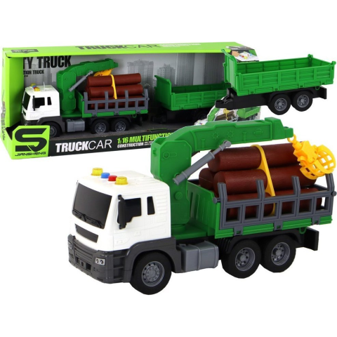 1 kép leantoys Teherautó - Daruval, Pótkocsival, Súrlódó Meghajtással, Fa, 1:16, Zöld (16617)