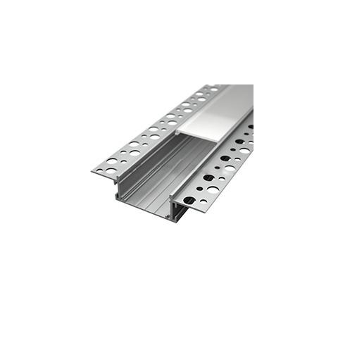 Ezüst színű ALP-014 alumínium LED profil - LED szalaghoz, fehér színű, opál búrával: az ALP-014-es ledprofilokat gipszkartonba lehet beépíteni. A beépítés során a lyukacsos felületet el kell glettelni.