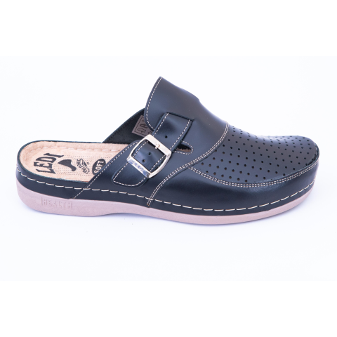 Ledi Anatomic Férfi Papucs LEDI-802-10. Színe: feketeA belső talp rész puha bőrből készült, alatta a láb anatómiájának megfelelő emeléseket, tartó pontokat, akupresszúrás pontokat ingerlő párnázat található, ami kényelmes akár 24 órás viselést is lehetővé tesz.A természetes bőrnek és a lyukakkal ellátott felső résznek köszönhetően a láb jól szellőzik, és nem izzad be.Viselése ajánlott lábfájós, lábégésben sz
